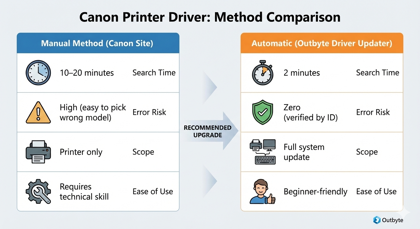 Let’s be honest: manual searching for Canon drivers is often a lottery. Canon has hundreds of similar-sounding models, and installing a driver for a "nearly identical" model can lead to system errors or poor color reproduction.