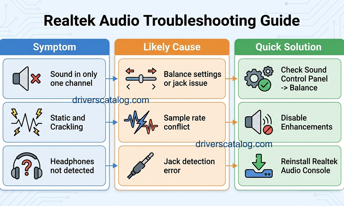 Realtek releases hundreds of codec versions (ALC887, ALC892, ALC1220, etc.). Problems usually arise due to: