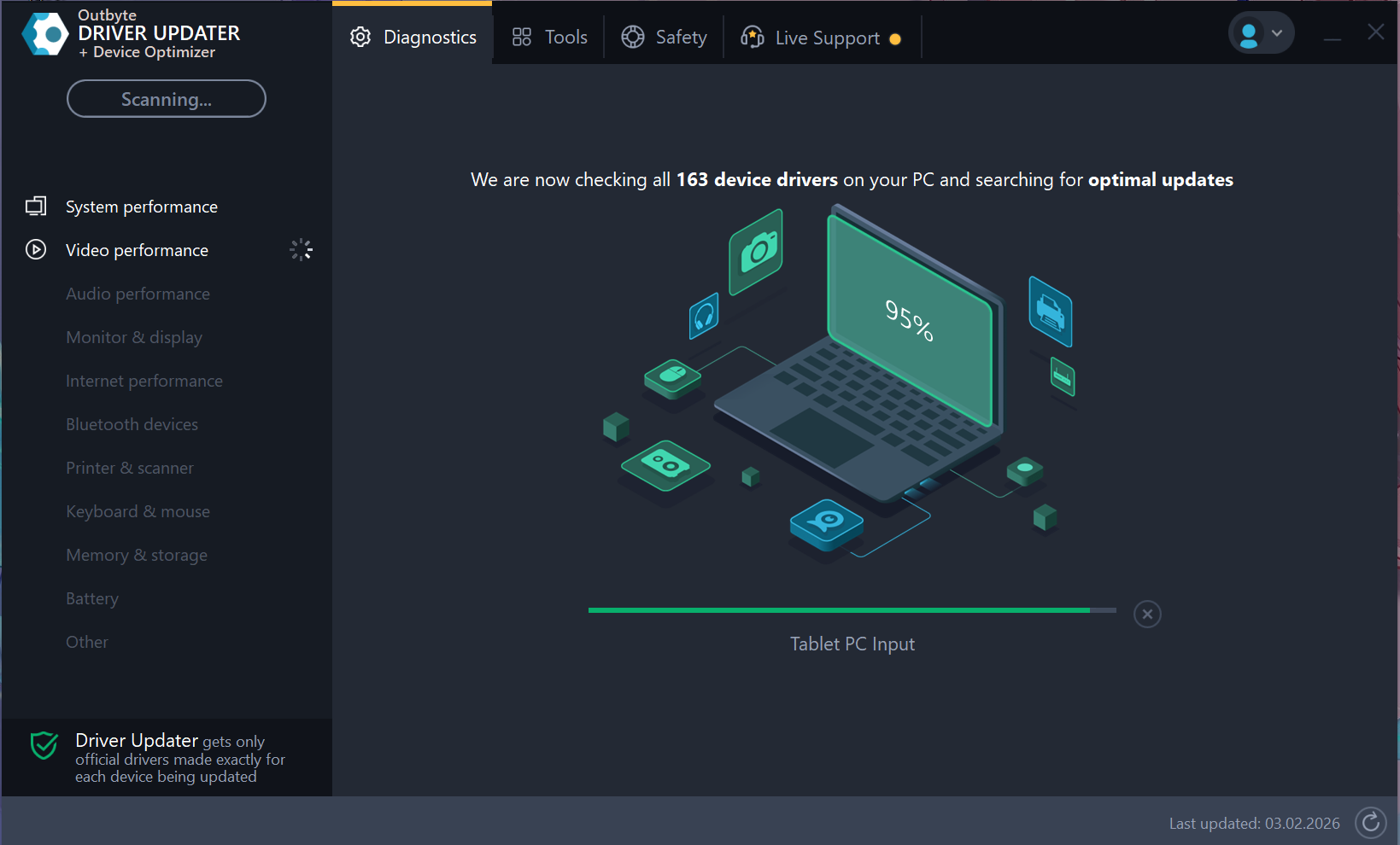 - As seen in the diagnostics window, it checks over 160+ device drivers (including video, audio, and internet components) to find the most optimal updates for your specific PC build.
