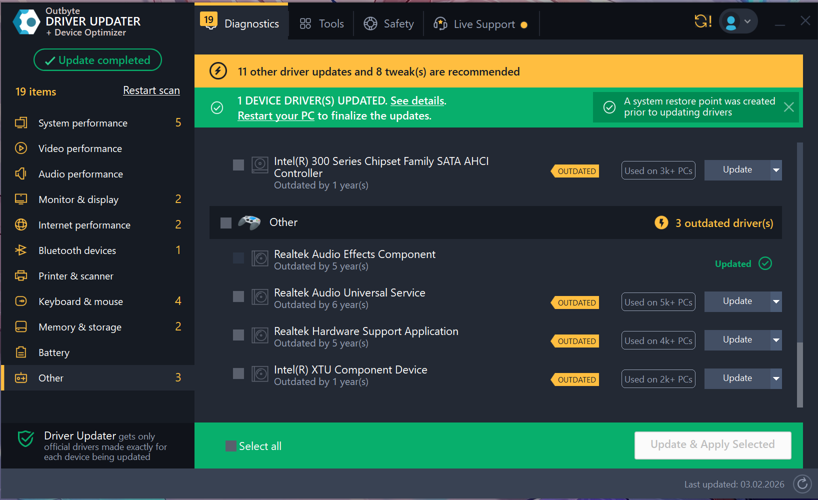 - It lists the number of drivers to be updated and tweaks to be applied.