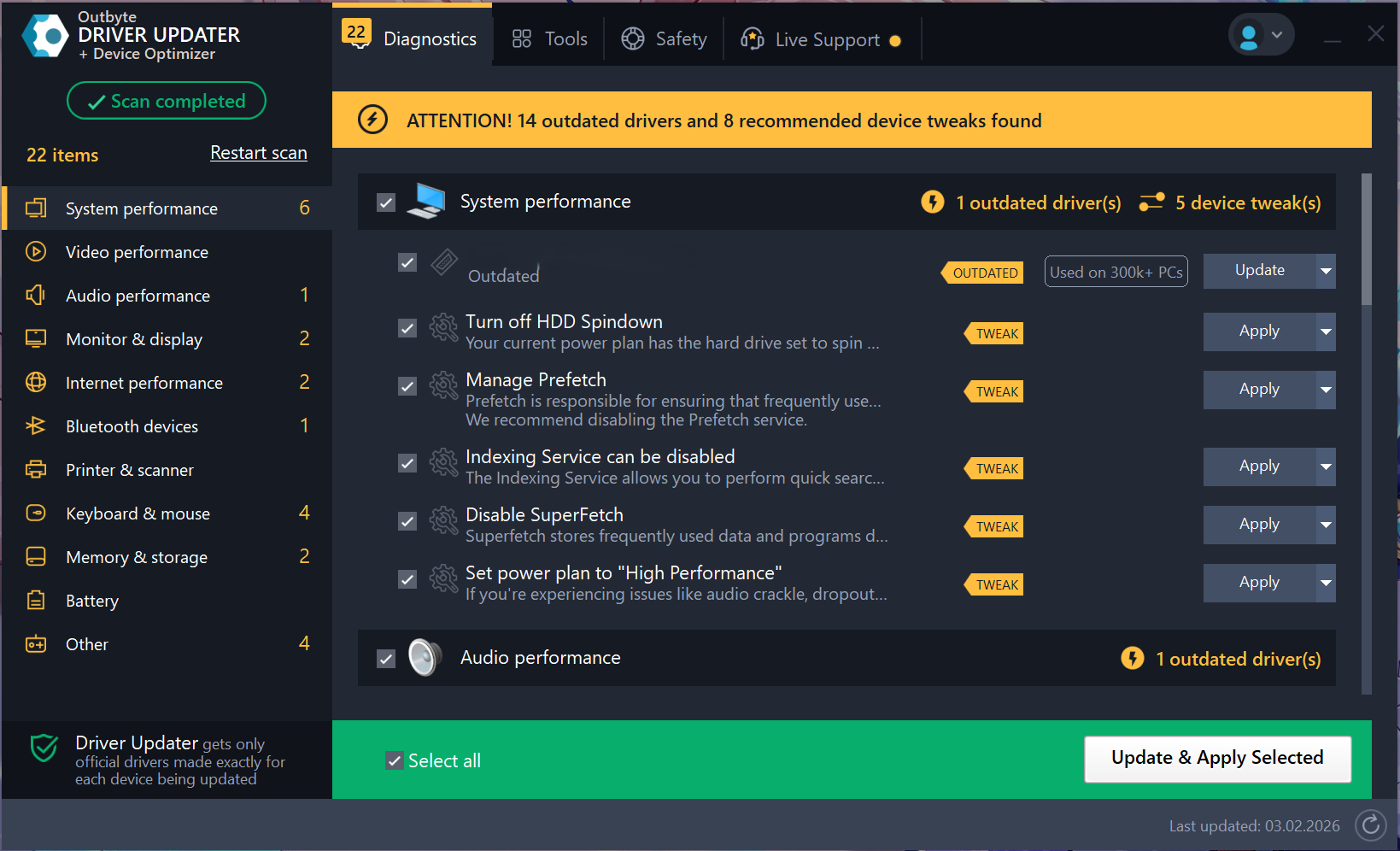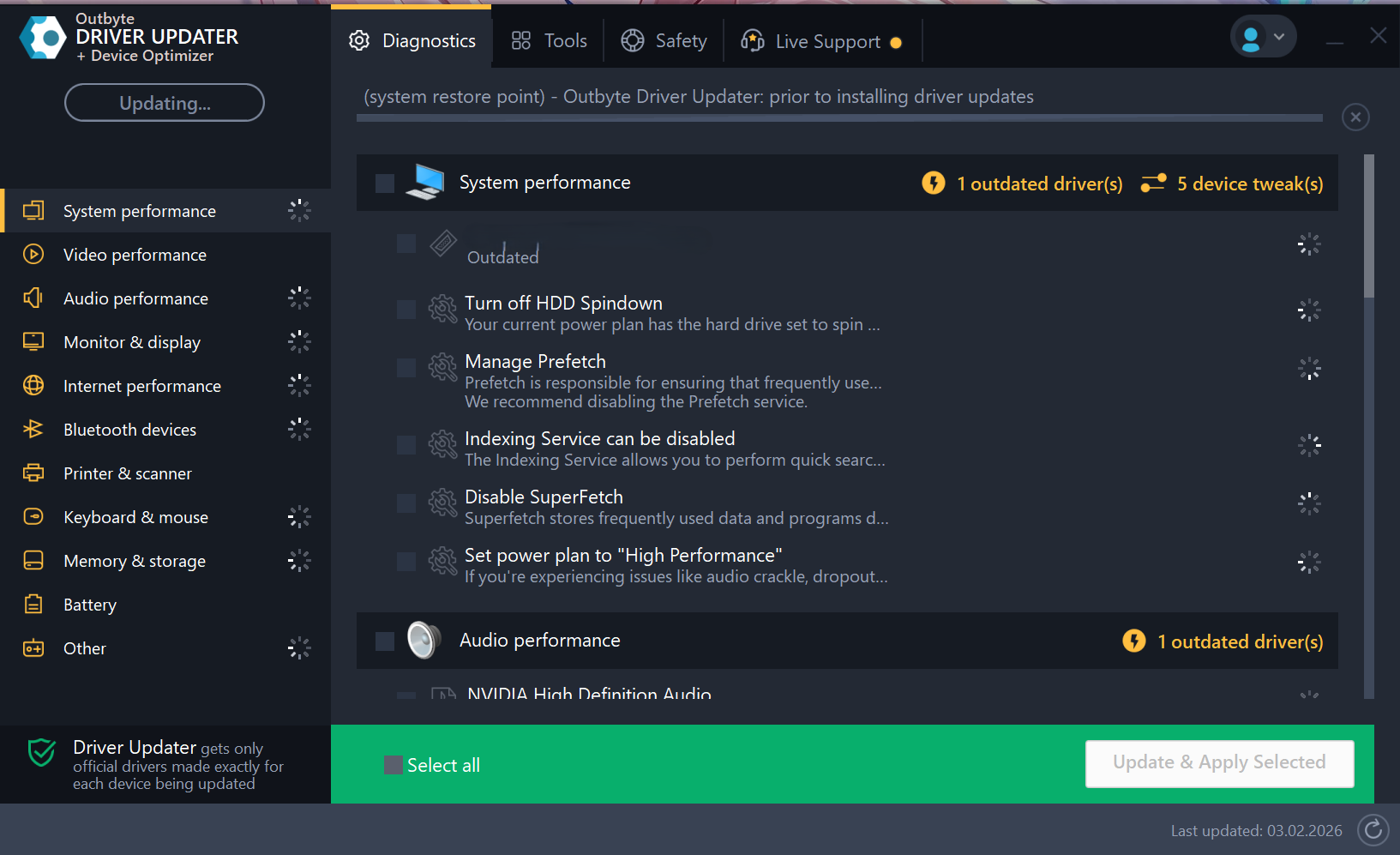 - Manual Selection: If you only want to update specific items, check the boxes next to the individual drivers (like "Audio performance" or "Keyboard & mouse").
